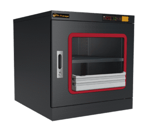These dry cabinets are available in a range of sizes from a capacity of 202L to 1250L and are plug and play, featuring a rugged, air tight design. Standard features include an anti-static package, adjustable shelves, locking doors, storage bins, a digital display, calibration reminder, and sensors with high accuracy.